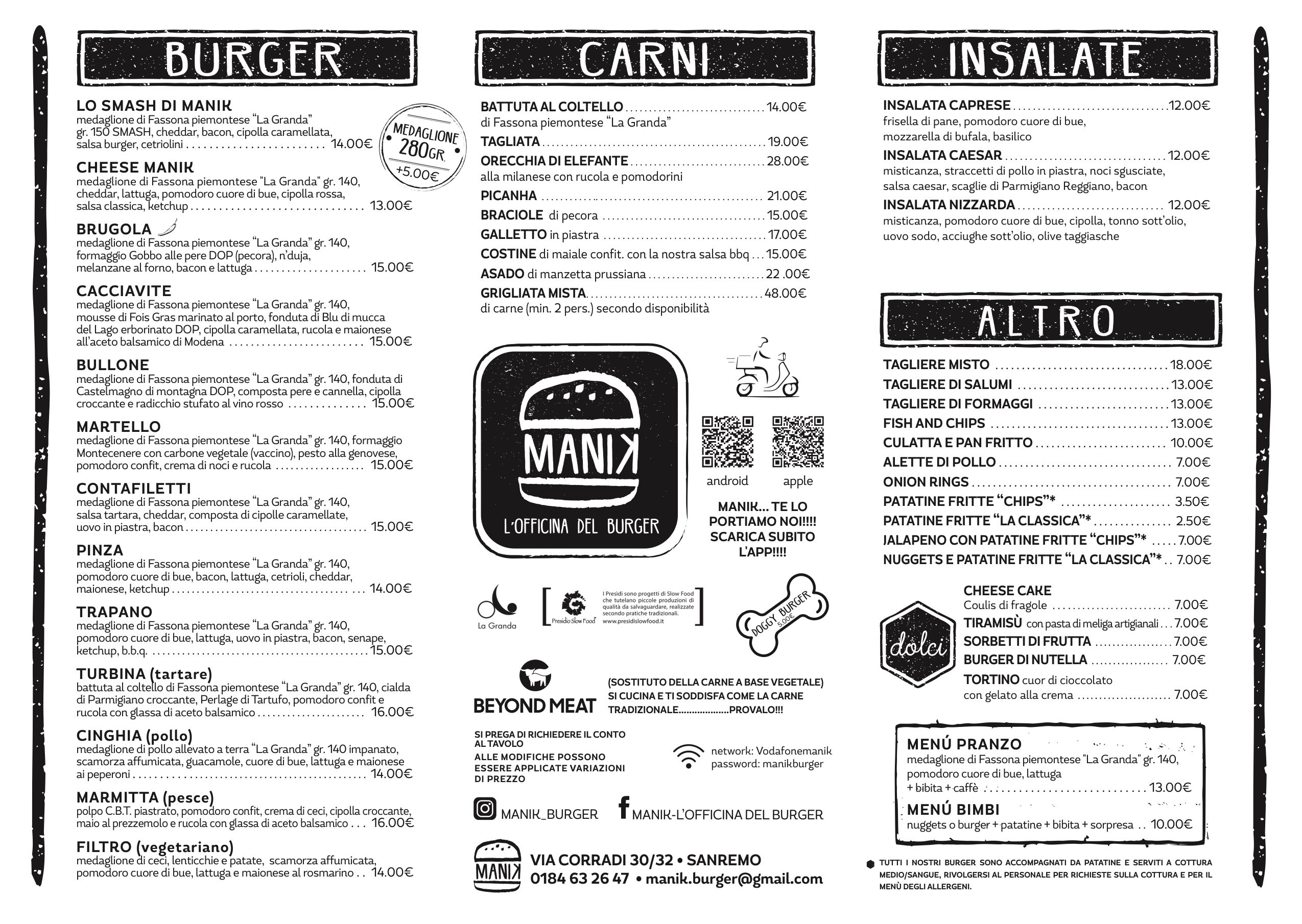 A warm welcome awaits you at Manik l'officina del Burger. We're excited to be your host in sanremo! Come and enjoy yourself in our bakery. We can't wait to see you! We invite you to enjoy our authentic american cuisine and italian cuisine. Our friendly staff will serve you with the best traditional cuisine here. Sit and enjoy our skillfully prepared burger, grill, sandwich, and fries, designed to cater to all tastes. If you have a sweet tooth, you will enjoy our delightful cakes and tarts, cheesecake, and tiramisu. At our establishment, we cater to your individual dietary preferences by providing a range of gluten free and lactose free options. Refreshing beer, wine, and coffee are also available for you to enjoy. Feeling hungry? Visit us and enjoy tasty lunch and dinner in a relaxing space. As well as serving food, we provide nice music.